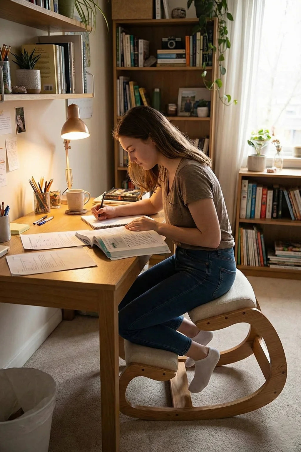 Research indicates that kneeling chairs reduce lumbar pressure, enhance alignment, and promote more neutral posture than standard office chairs.